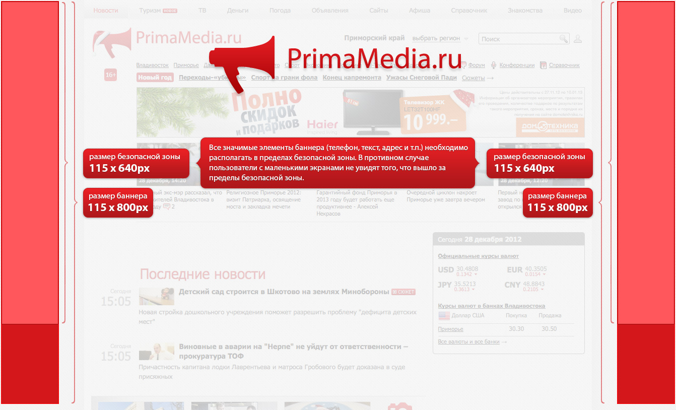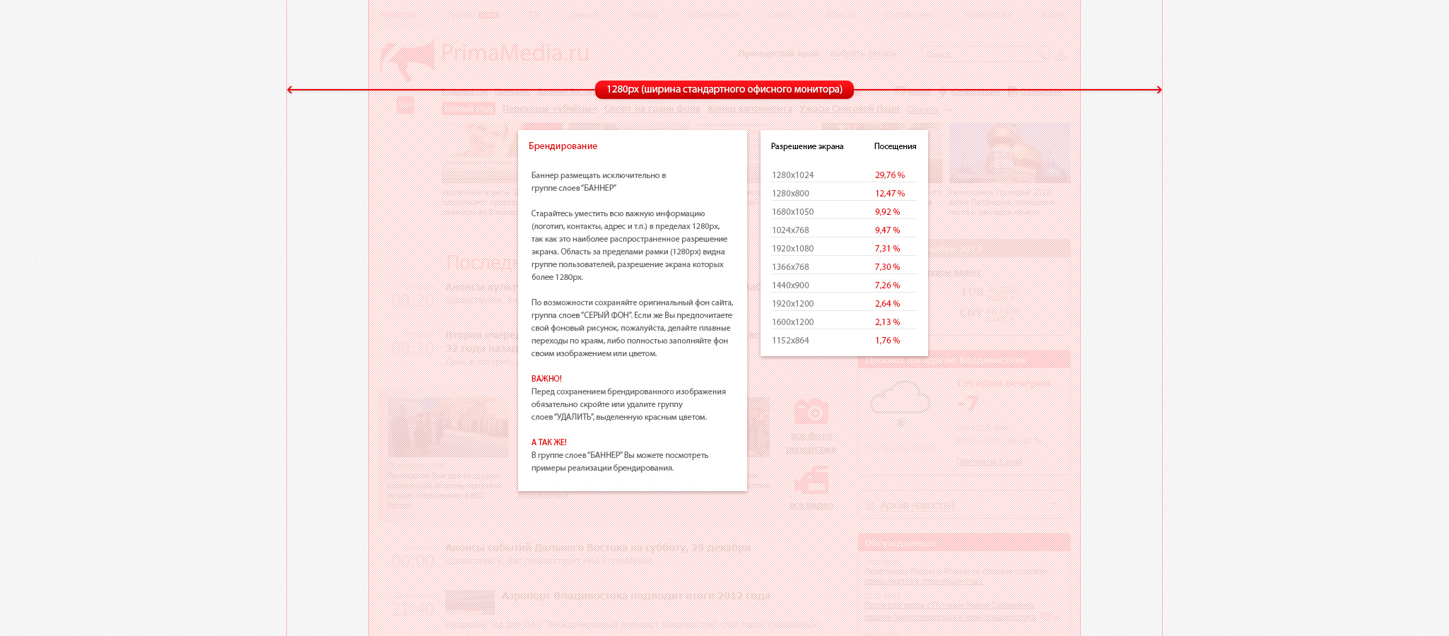 Ограничение на вес файлов обусловлено общим весом страницы. Если страница долго загружается, если долго загружаются ваши баннеры, то их увидит меньше посетителей и эффективность рекламной кампании будет низкой. Требования к Flash-баннерамВерсия flash-проигрывателя, в которой скомпилирован баннер, дожна быть не выше 9-й. Для учета нажатий на flash-баннеры, в качестве ссылки необходимо использовать в баннере объект button со следующими параметрами: on(release) { GetURL(clickTAG, "_blank"); } и открываться в новом окне. Первый параметр обязательно должен быть без кавычек. Если же, вместо переменной clickTAG будет вставлен непосредственно адрес рекламируемого сайта, то при нажатии на баннер будет происходить переход сразу на него, при этом факт перехода невозможно будет отследить. Название переменной продиктовано требованиями системы показа рекламы. Поэтому предлагается адрес передавать через параметр в коде HTML. В результате, баннер ссылается на специальный сценарий на сайте рекламной площадки, который учитывает переход (добавляя запись в журнал) и производит перенаправление на сайт рекламодателя. Внимание! Для flash-баннеров рекомендуется предоставлять дублирующий gif-баннер - так называемую заглушку, которая будет показываться пользователям, у которых выключен или не установлен модуль Flash в браузере. Требования к боковым баннерамРекомендации и пояснения при изготовлении боковых баннеров: Требования к брендированиюРекомендации к брендированию отражены в шаблоне, который в формате Photoshop можно скачать здесь. |